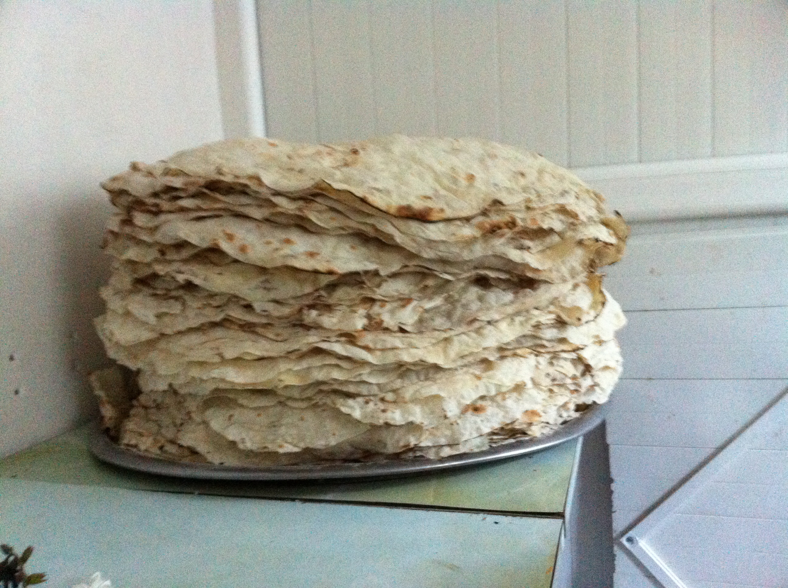 Turkish breakfasts are typically raw sliced tomato, raw sliced cucumber, two types of cheese, a boiled egg, fresh bread and honey. Next to the dining table where we sit is another small square table piled almost 40-50cm deep in huge fresh cooked circles of flat Yufka (bread).