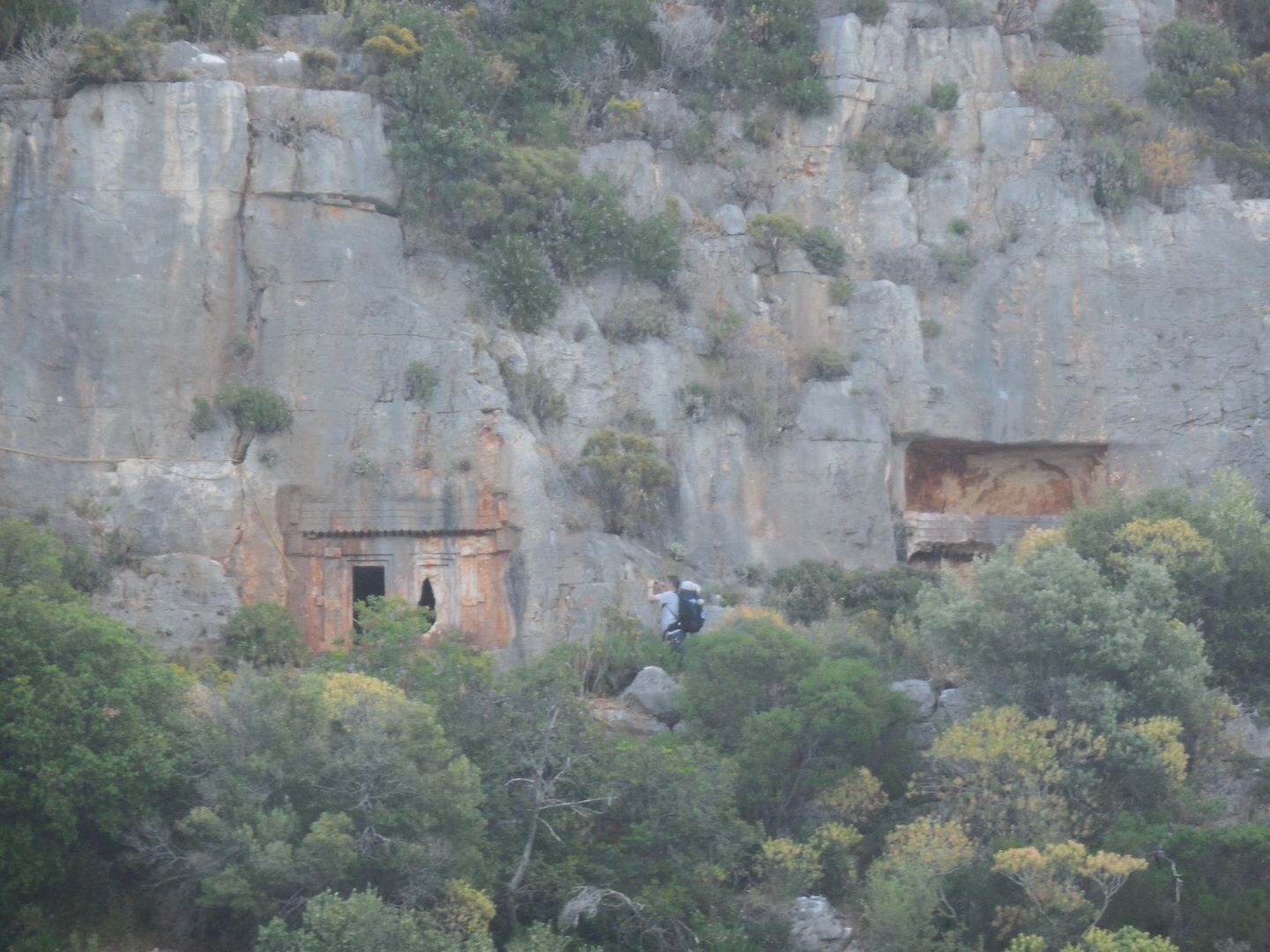 As our boat towards Liman Agazi chugs along the smooth waters of the bay the following day I get some zoom shots of the cliffside crypts the walking track passes before we moor beside a beachside resort.