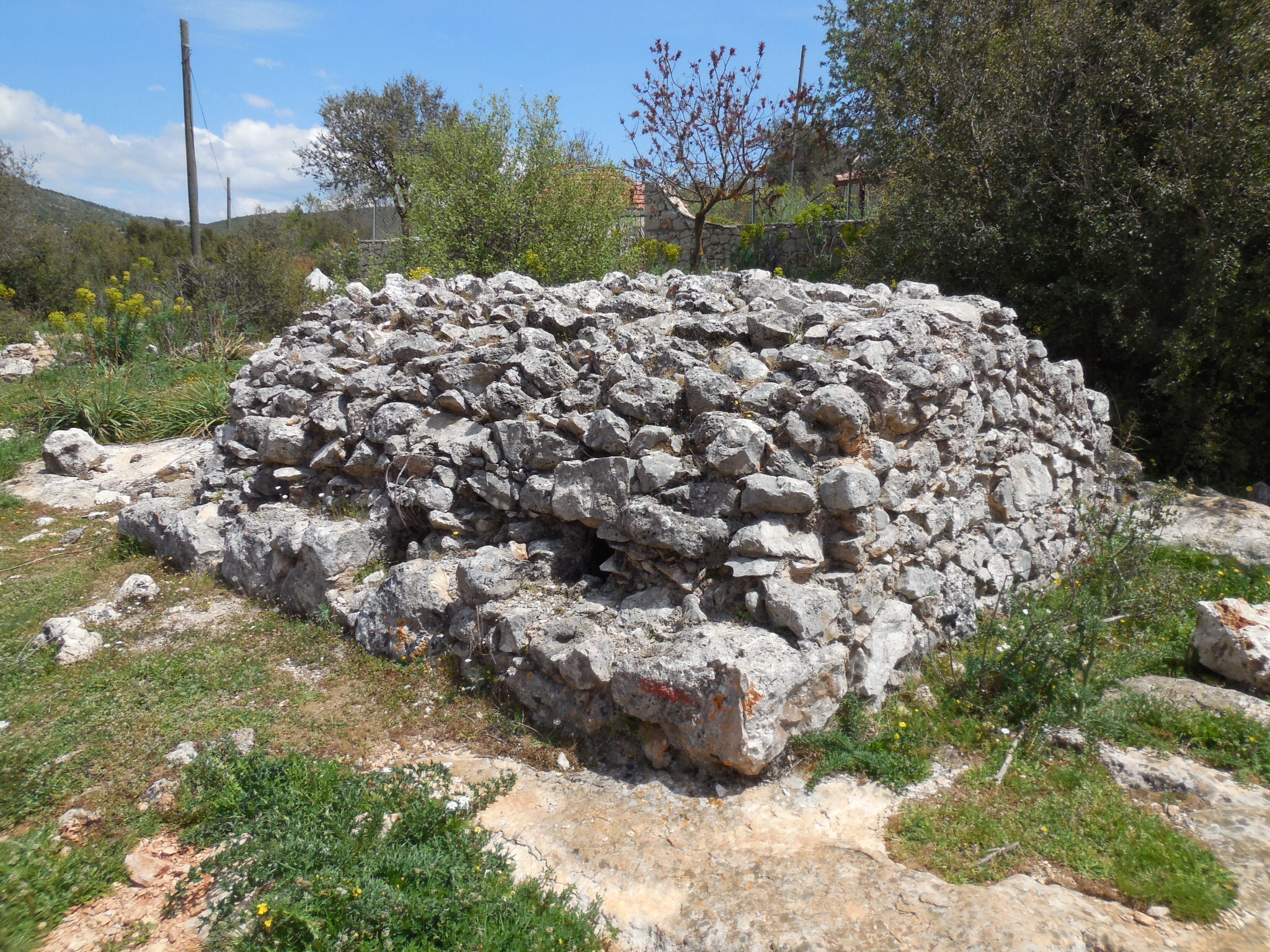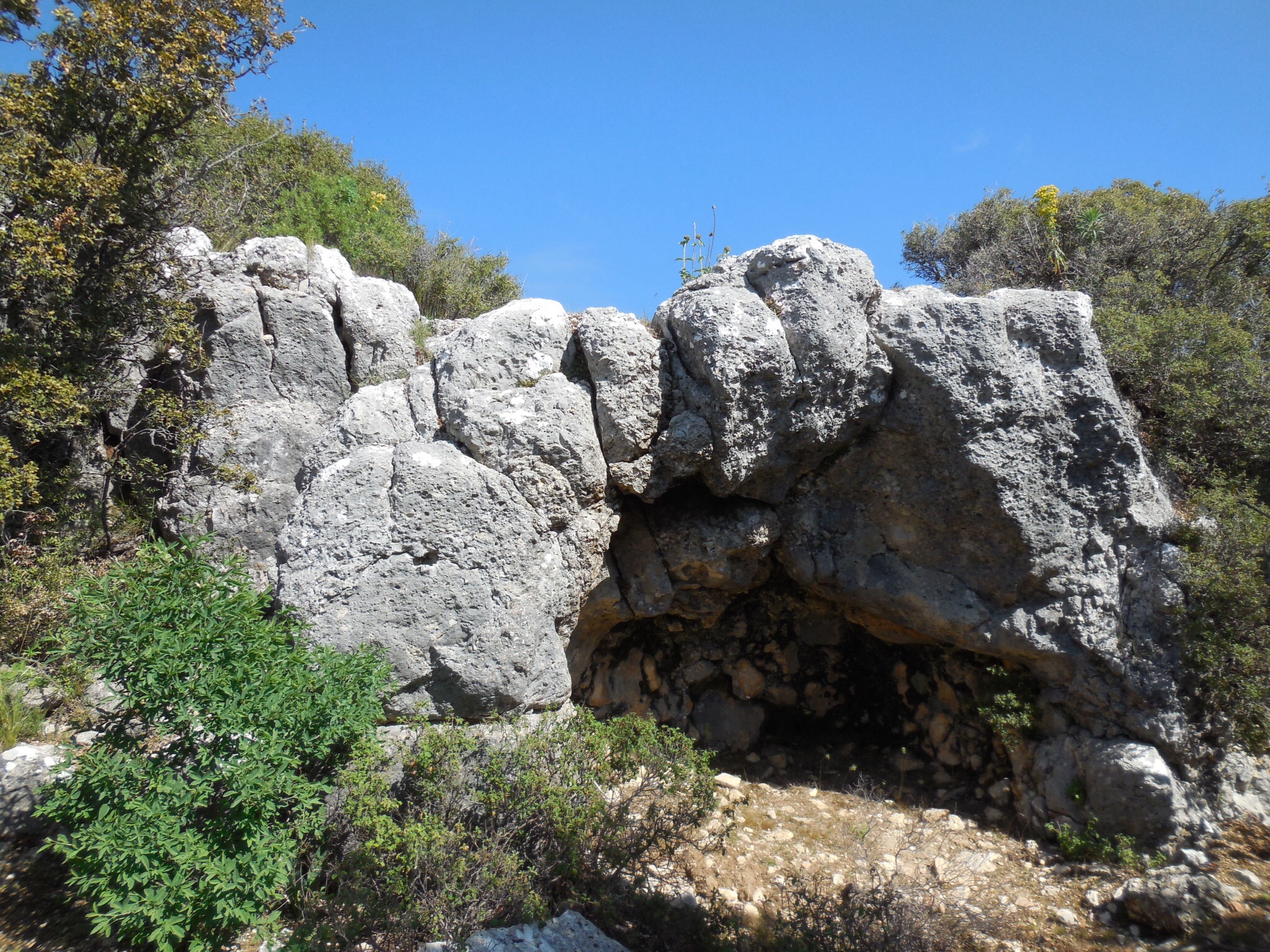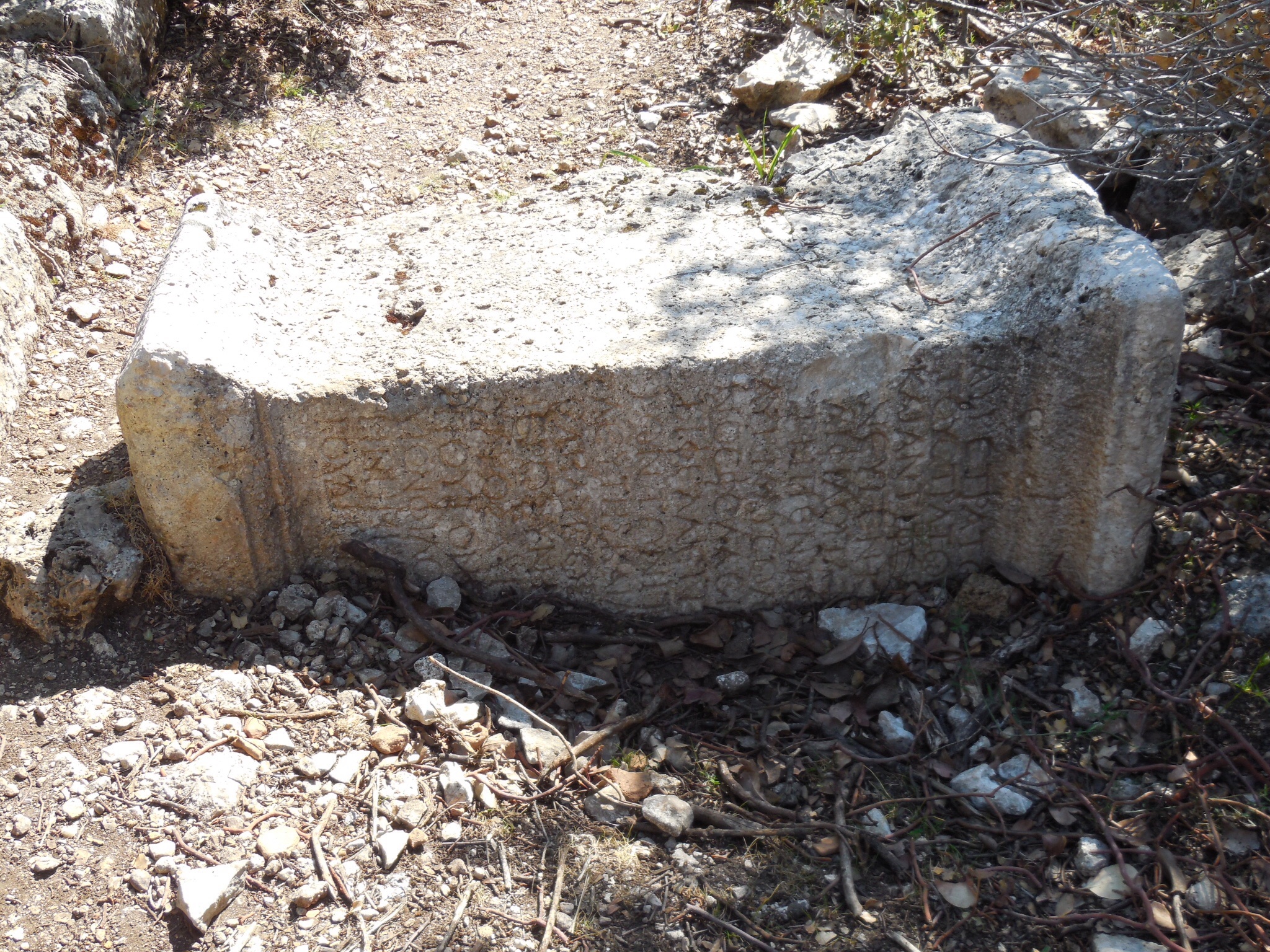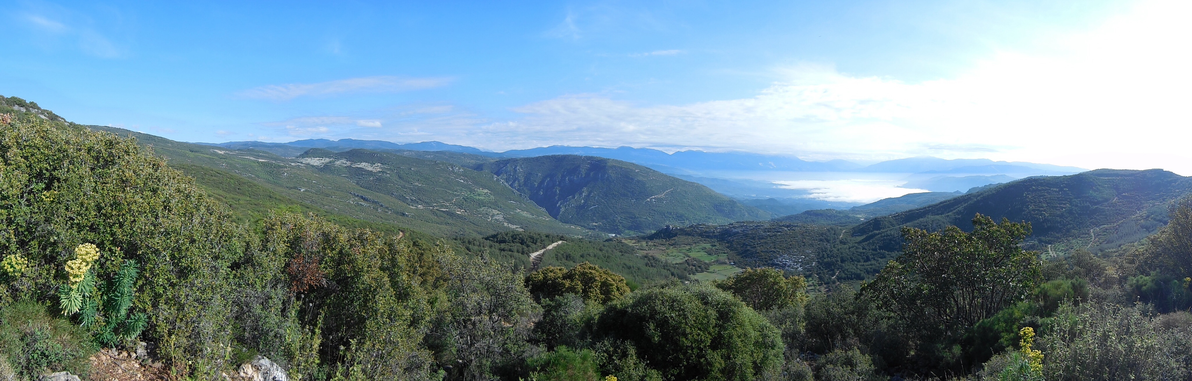 After a short gradual uphill section we contour gradually downwards making rapid progress following the line just under a descending stone ridge, across the saddle, to a final steep scramble where fallen rectangular masoned stones alert us we are nearing the Phellos ruins.