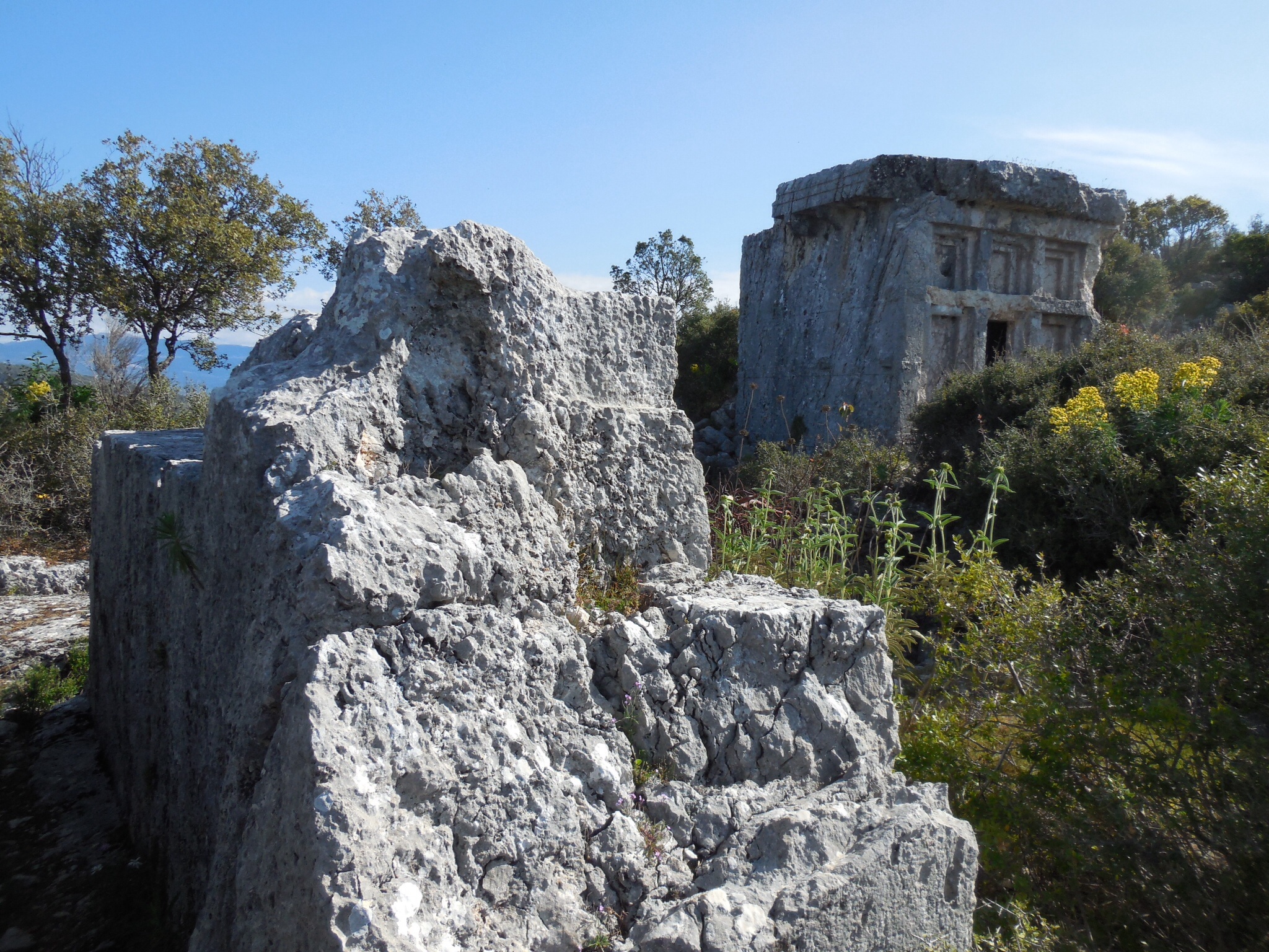 Perched atop the highest peak of a steep ridge that forms the southern rim of Derekoy valley Phellos was thought to be a small garrison city or religious sanctuary and burial site. With no carved or decorated buildings of the Roman period remaining Phellos is famous for the now headless stone bas relief of a life sized bull that adorns one of the surviving walls.