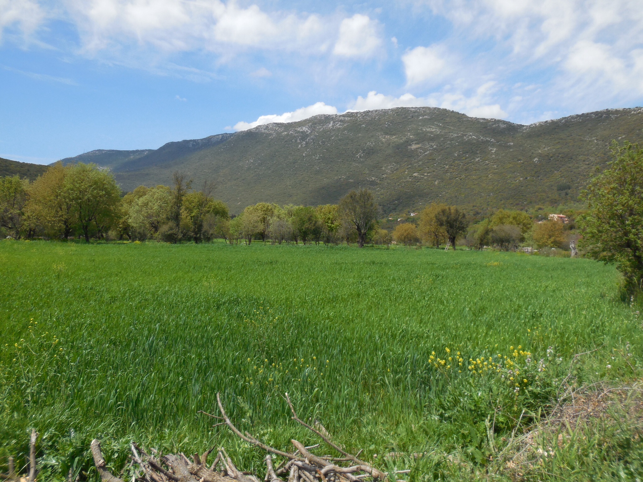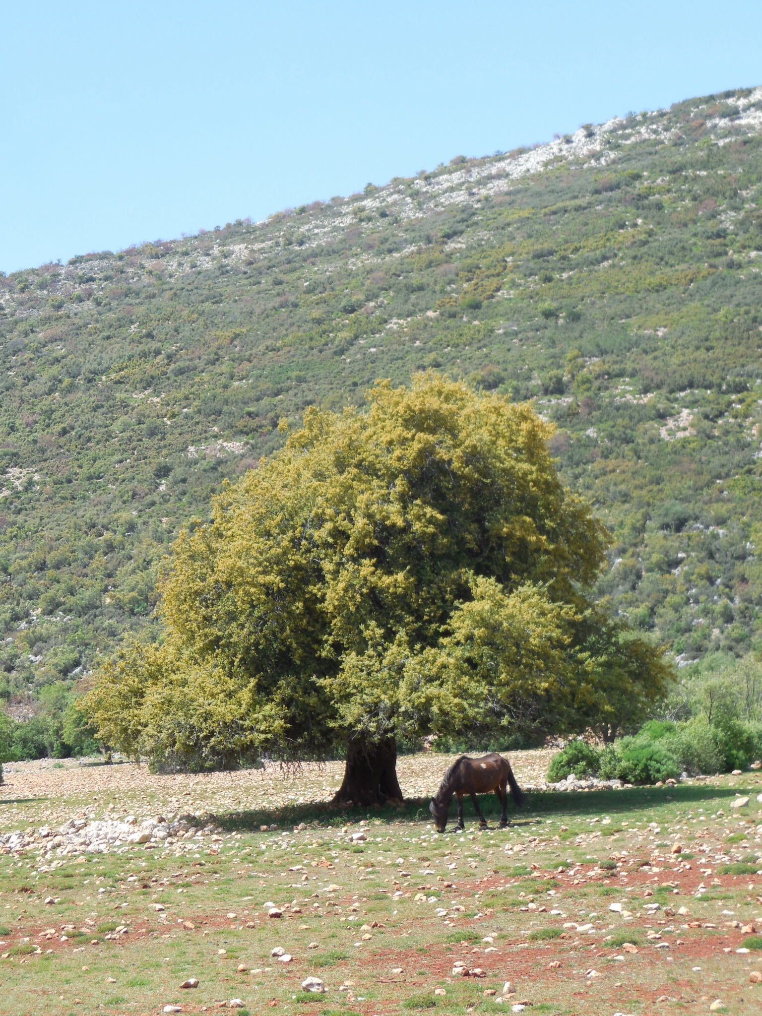 Grass clipped short by grazing sheep and goats exposes grey and white stones laid bare in the usual fashion. A lone horse grazes near the shade of a tree.
