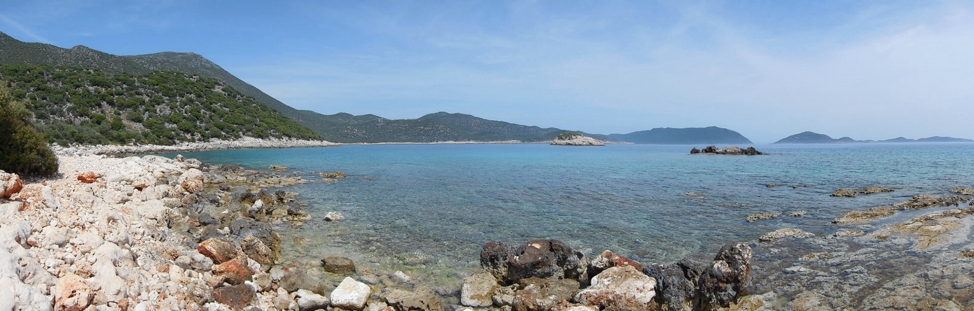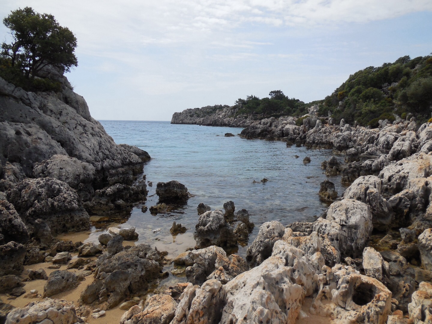 Never content with a road where a rough treacherous goat track provides much more adventure the Lycian turns away a few hundred meters on and we make our way around a headland just a few meters above the white stones of the water line.