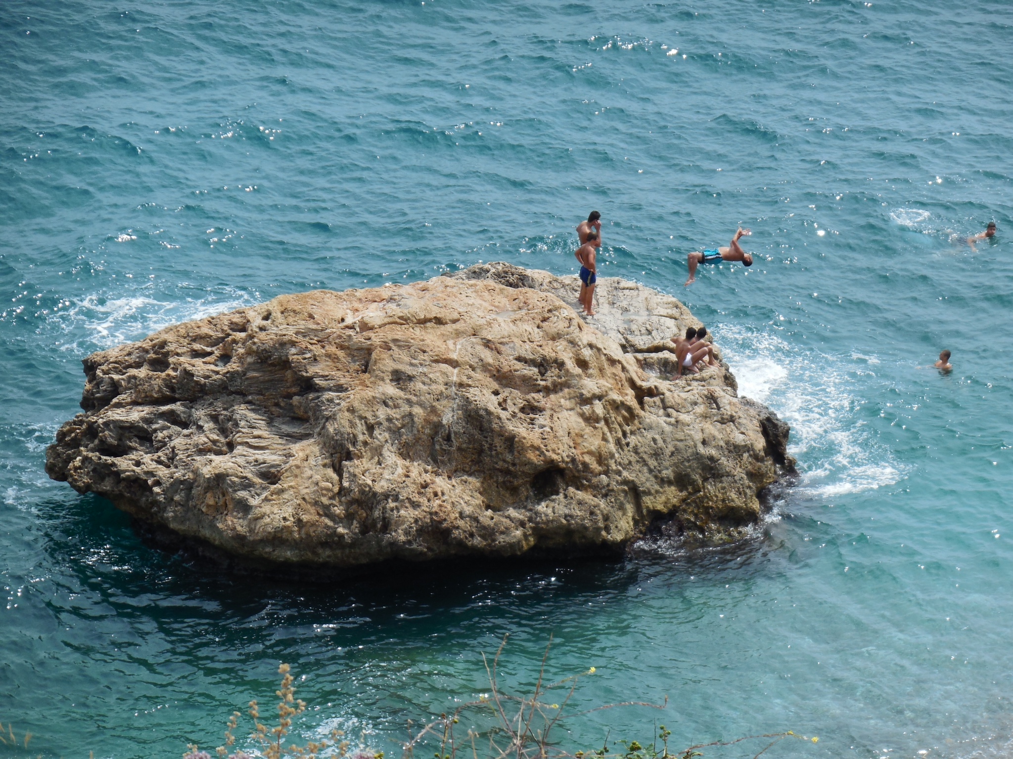 From the base of the cliffs where we stand our view extends uninterrupted, sweeping all the way from the large rock in the sea where young men find ever more gymnastic ways to hurl themselves into the Mediterranean to the distant mountains, now veiled in smog, we have so recently clambered up and over.