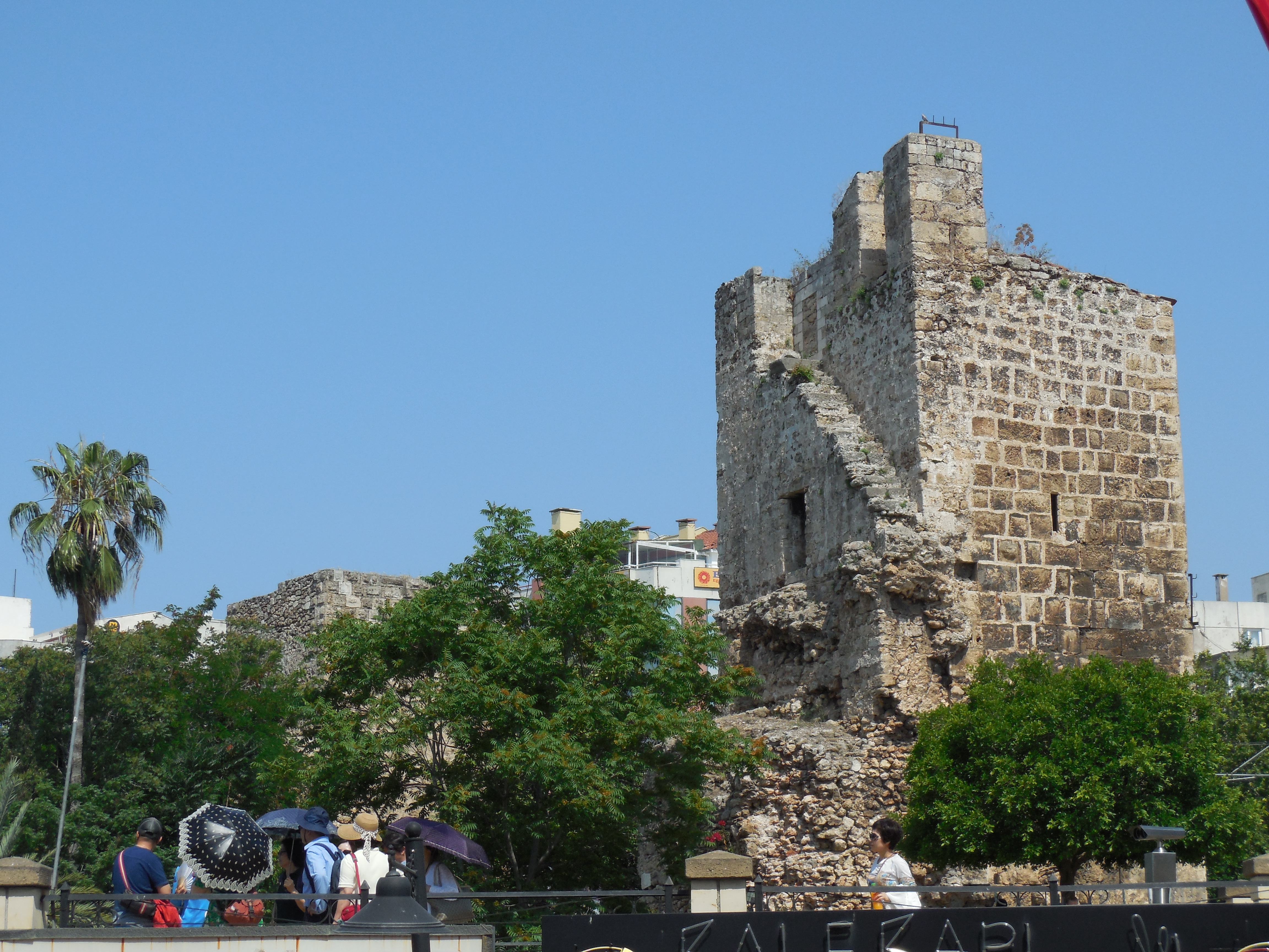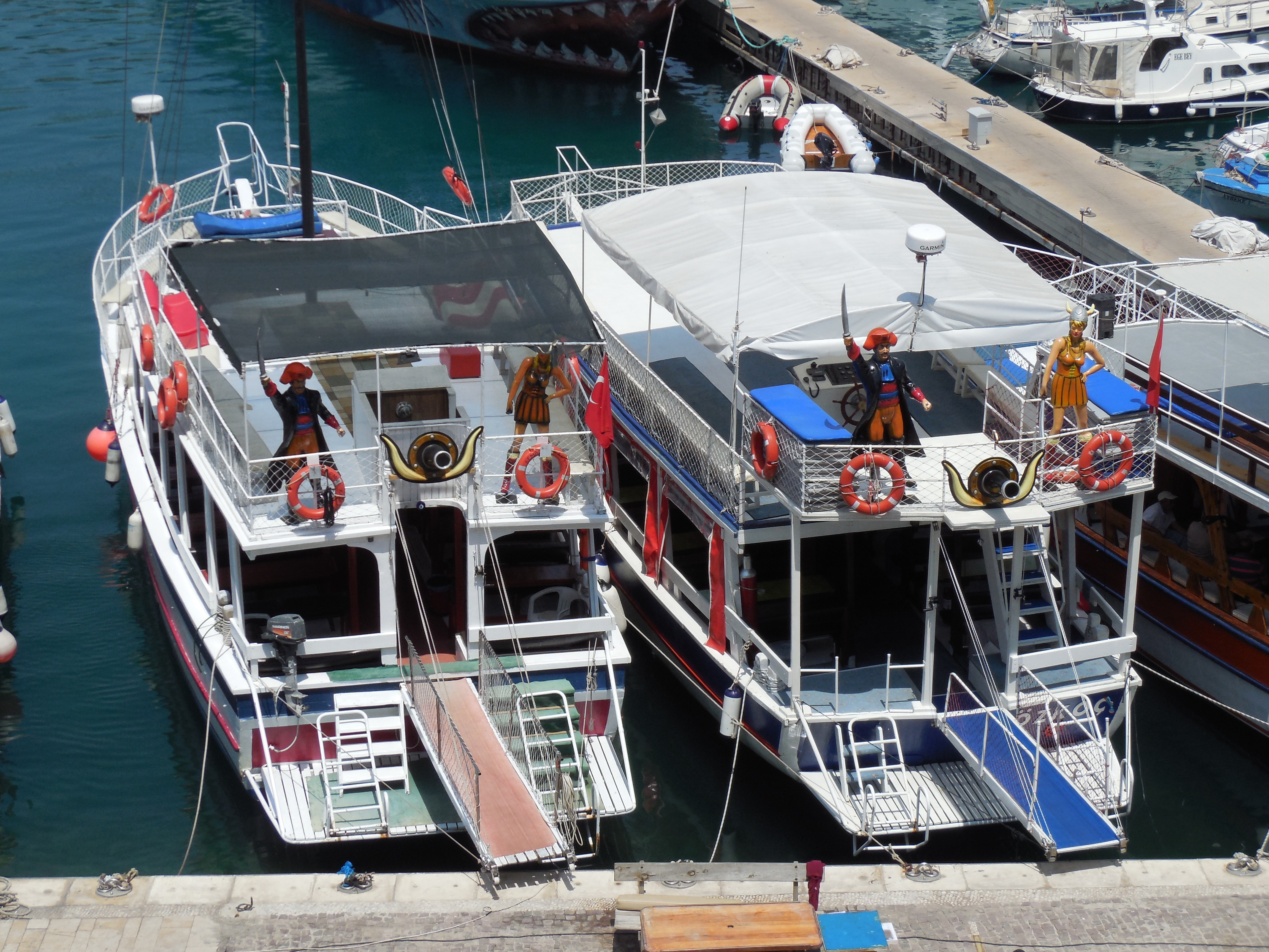 Stone walls and cliffs ring the harbour which provides anchorage for tourist boats where gaudy plastic pirates welcome revelers aboard. Ancient ruins, minarets and red tiled roofs of the Ottoman era houses give way to almost omnipresent pale multi-story apartment blocks.