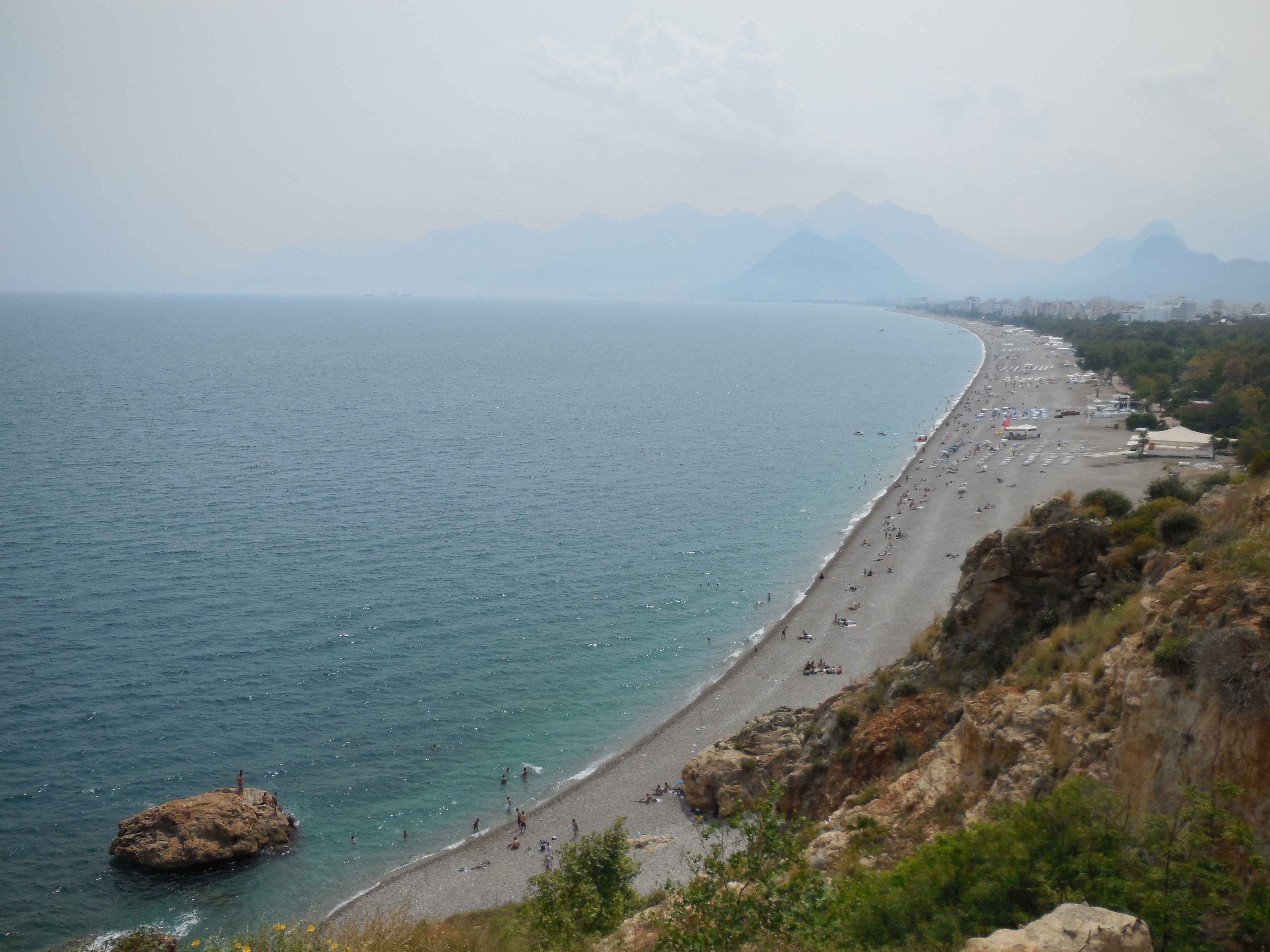 Antalya is Turkey’s fastest growing city and seemingly forms a long narrow arc of multi-story buildings following the curve of the bay with the cliffs of the ancient harbour and old city district of Kaleiçi splitting two long sweeping shale beaches.