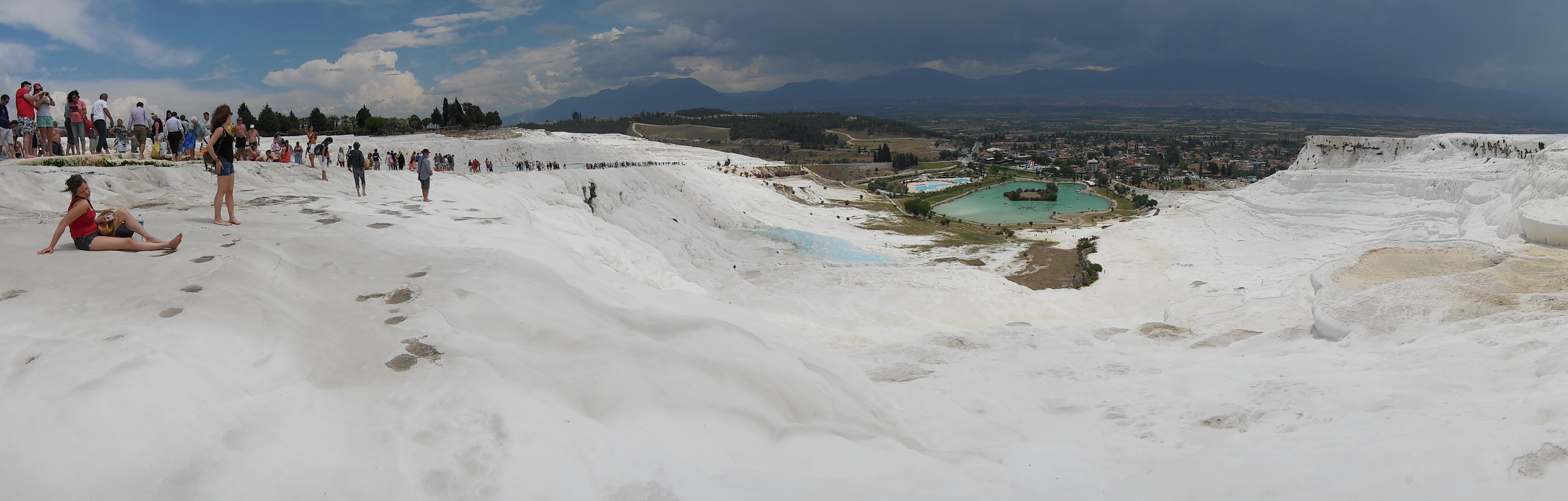 Pamukkale which translates roughly as ‘cotton castle’ has always attracted visitors, people have been bathing in the seventeen thermal springs within this area for thousands of years. The ancient Greco-Roman and Byzantine city of Hierapolis was built on top of the white ‘castle’ which is in total about 2,700 metres long, 600 metres wide and 160 metres high.