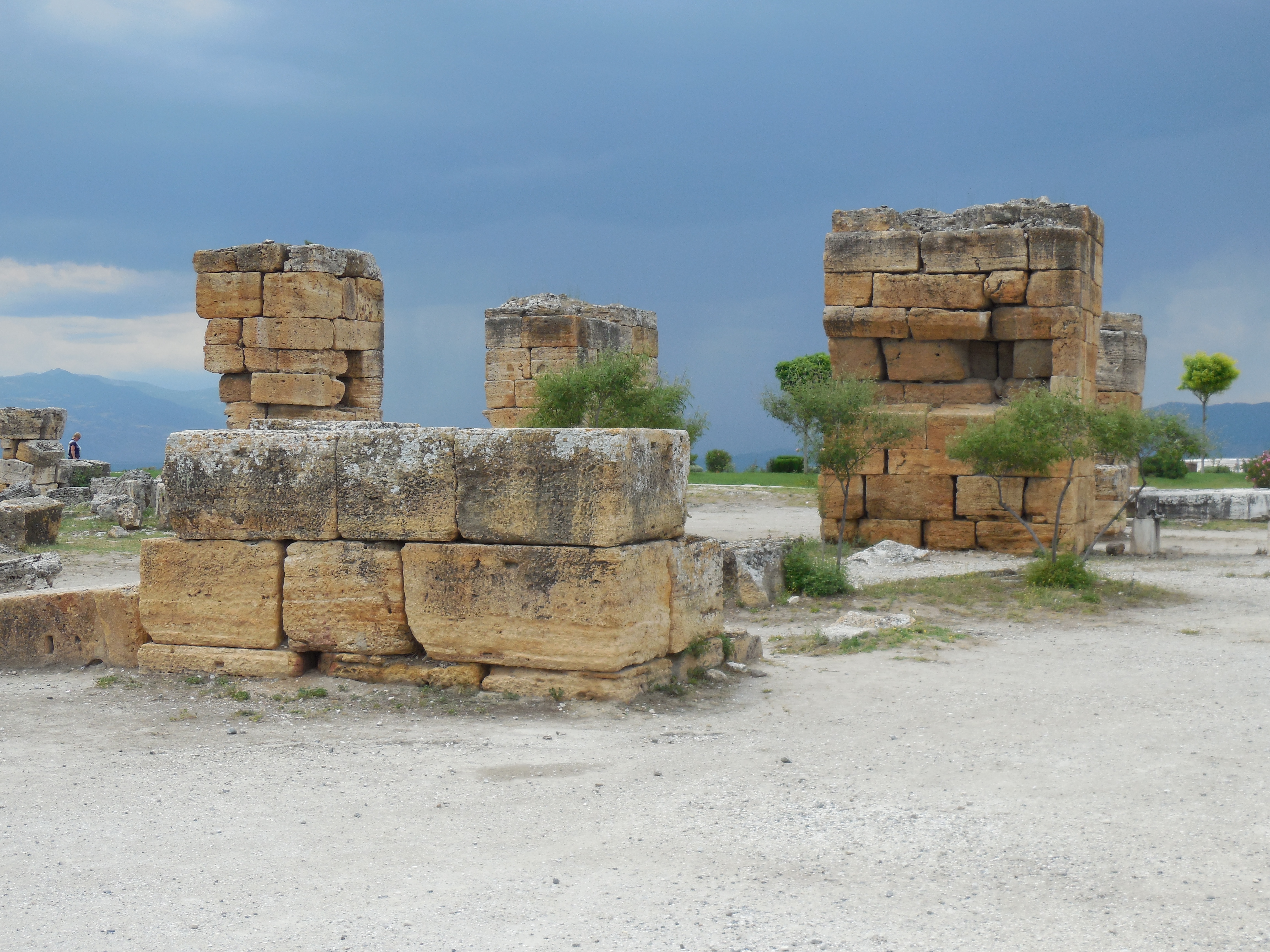 Ruined Hierapolis covers a vast hilltop area and with a localized shower ahead beginning to crack lightning bolts into the valley to our left we elect to head right and make our way steeply upwards to the huge stone remains of the amphitheatre which has much of its almost 100m long facade still standing.