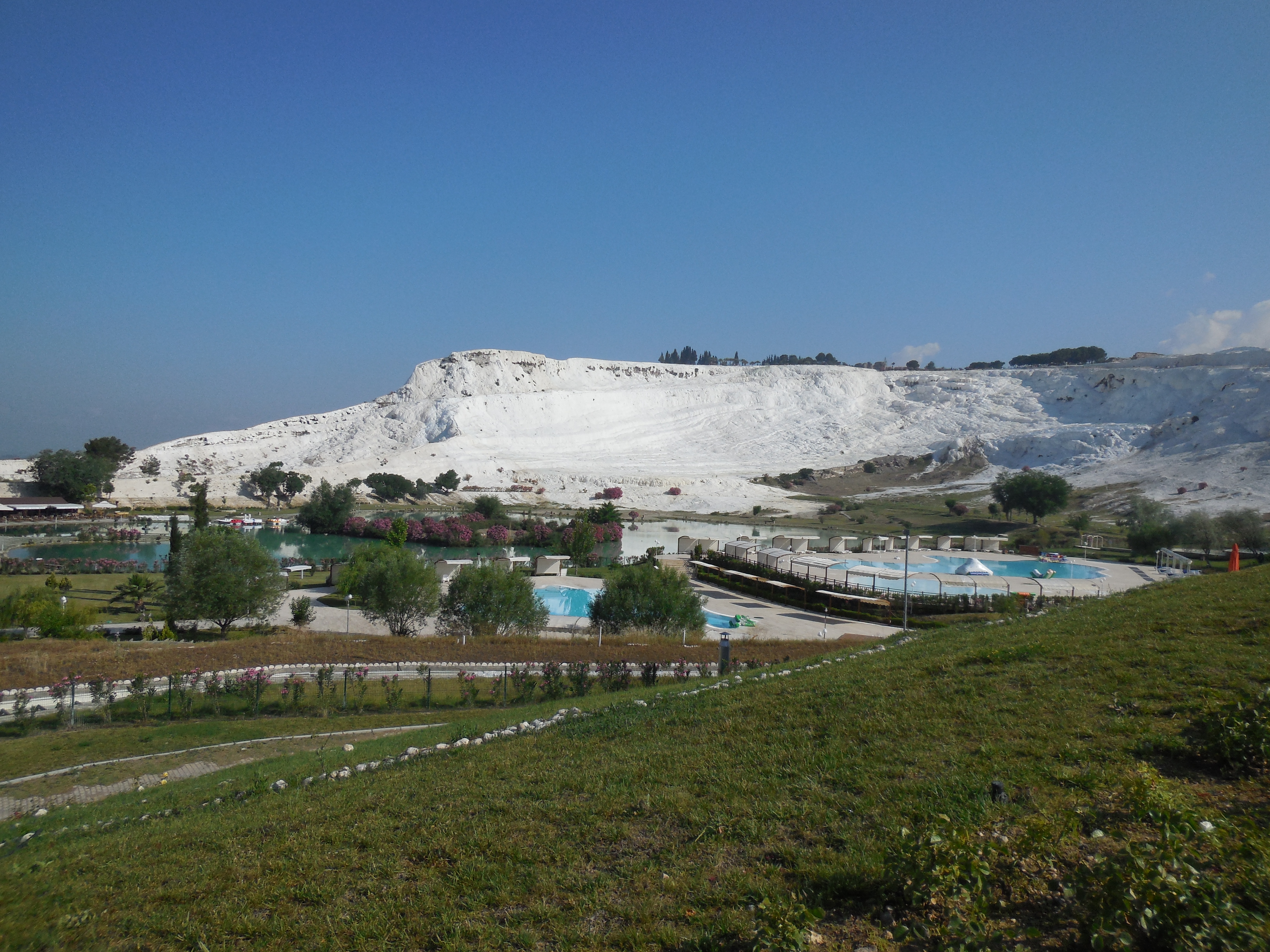 Immediately across the narrow road where we alight is a large hotel and keen to attack the vast white travertine slopes we have seen glistening from afar on the insane rush into town we waste no time looking further for accommodation.