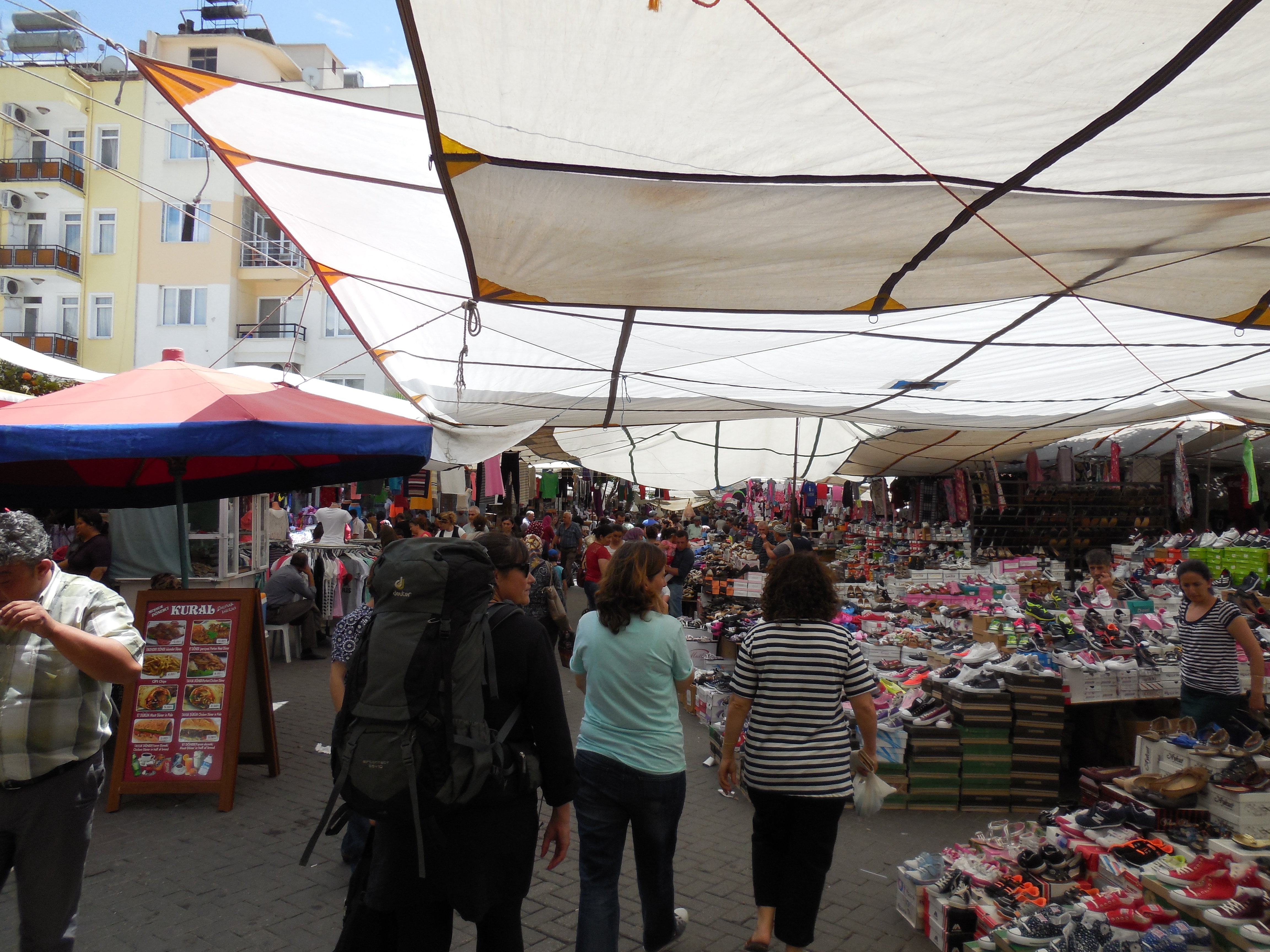 Selcuk is colourful and bustling with people and just beyond the aqueduct remnants is a line of restaurants all doing a roaring late lunch trade.